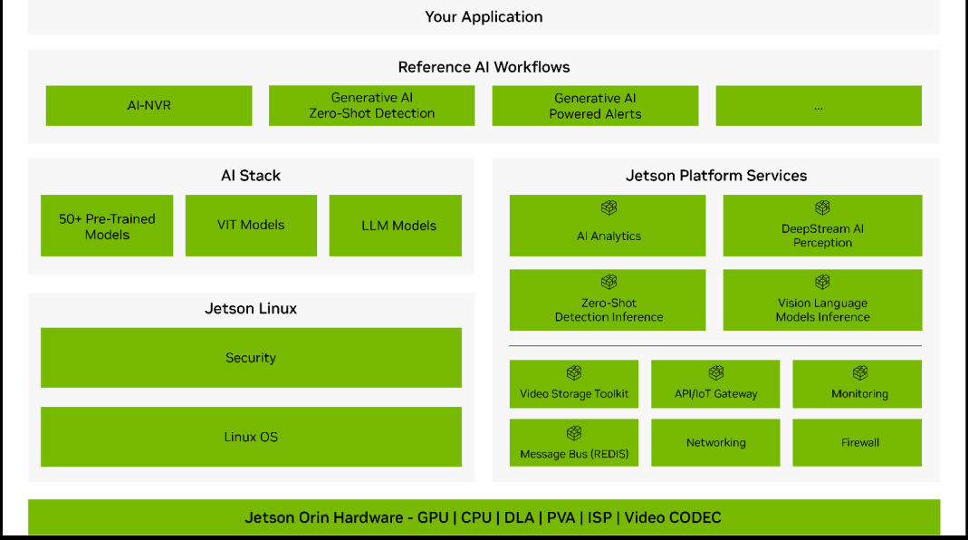 Pandora utilizes NVIDIA® Jetson platform Services and SDKs, such as DeepStream AI Perception, Zero-Shot Detection and TAO tool kit to accelerate AI application development and Inference. With support for pre-trained models, vision-language models, and seamless AI integration at the edge, Jetson Linux provides the security and OS foundation, while Jetson hardware, including GPUs and DLA, powers high-performance AI workflows. Pandora's advanced hardware features make it an ideal platform for leveraging NVIDIA's full AI stack for edge solutions.